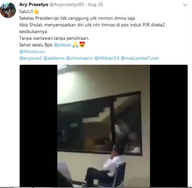 Video aksi Jokowi nonton laga timnas Indonesia tersebut viral di media sosial. Dalam video diunggah akun Istagram @bahrun.najach, tampak Jokowi mengenakan kemeja putih dan celana hitam duduk di kursi pos polisi menyaksikan Hansamu Yama Dkk berlaga di balik layar kaca.