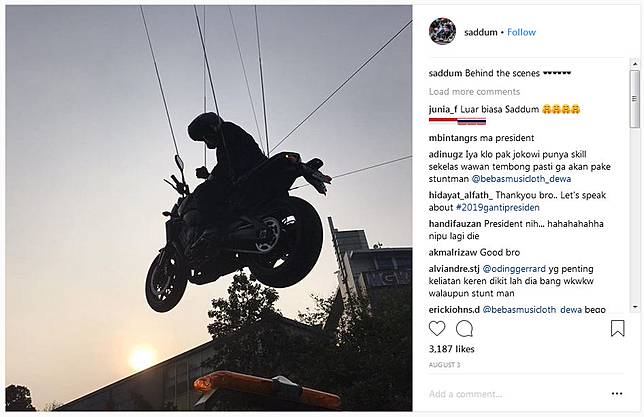 Aksi-aksi yang berbahaya itu rupanya mengundang tanya publik karena merasa bahwa hal itu akan sulit jika dilakukan langsung oleh Presiden Jokowi, mengingat Jokowi bukanlah seseorang yang ahli dalam hal tersebut. Usut punya usut, ternyata aksi berbahaya di atas motor itu dilakukan oleh seorang stuntman bernama Suddum So yang menggunakan jaket kulit merah pada gambar di bawah ini.
