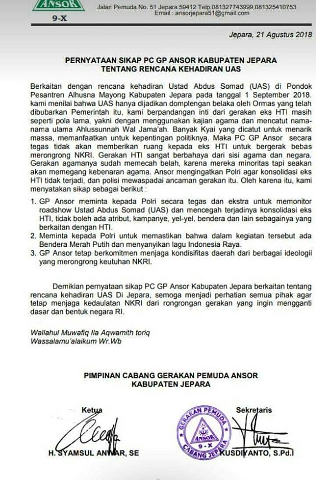 "Surat dikeluarkan PC GP Ansor Jepara," kata Mudjib.