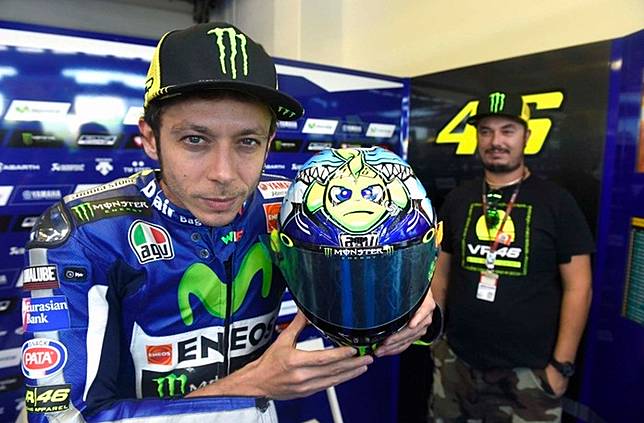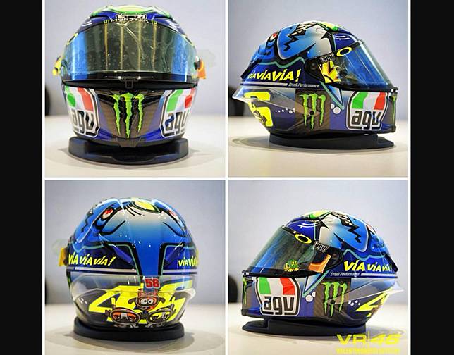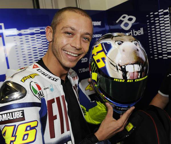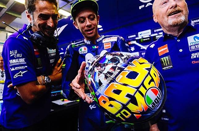 Dalam balapan hari ini di Misano, Rossi juga telah membuka ke publik desain helmnya. Desain helm baru ini menampilkan tulisan besar 'Back to Misano'. Seperti diketahui, Rossi absen dalam balapan seri Misano tahun lalu karena cedera.