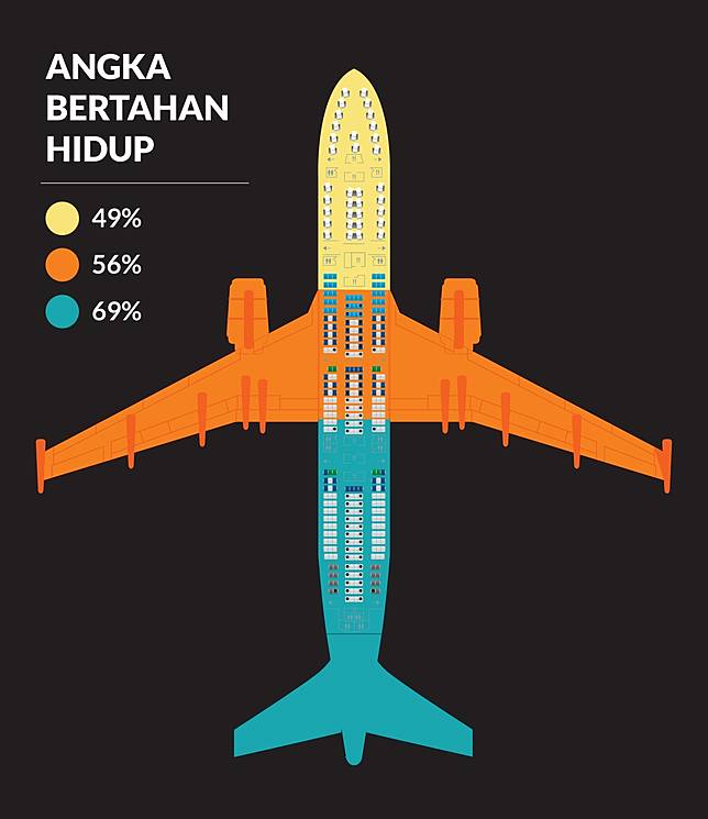Untuk penumpang yang duduk di tengah memiliki kemungkinan selamat sebesar 56 persen. Sementara posisi paling riskan ada di bagian awak penerbang, yaitu 49 persen.