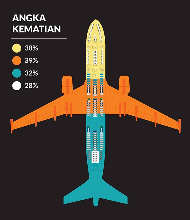 Tapi, angka kematian paling kecil ditunjukan pada mereka yang duduk lima baris dari posisi paling belakang. Penumpang pada seat ini kemungkinan mengalami kematian hanya 28 persen.