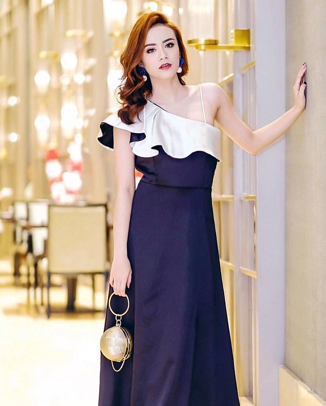 10. OOTD ala Dylan Sahara saat menghadiri pesta dengan dress off shoulder perpaduan warna putih dan navy.