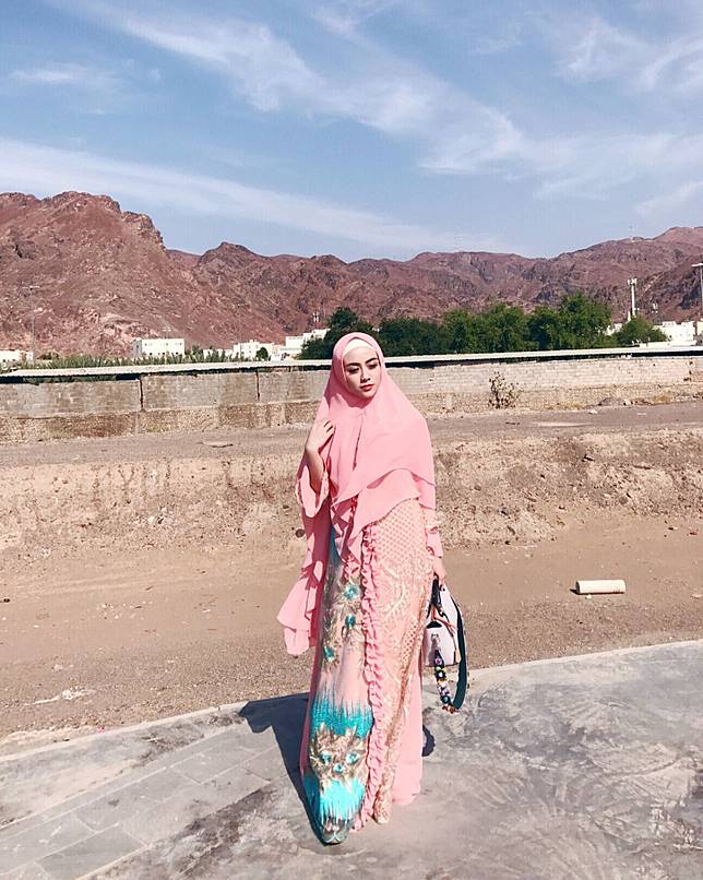 9. Gaya Dylan Sahara saat umrah yang makin cantik dalam balutan gamis dan hijab warna peach.