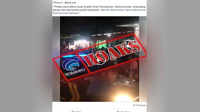 Hoax penculikan anak beredar di media sosial media seperti Facebook, Twitter dan WhatsApp. Hal itu meresahkan masyarakat terutama orang tua yang memiliki anak-anak masih kecil. Di Twitter, hoax yang beredar menyatakan pelaku penculikan anak tertangkap di Jalan Kran Kemayoran, Jakarta Pusat.