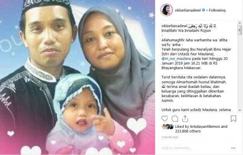 JAKARTA - Kabar duka datang dari keluarga Ustaz Maulana yang terkenal dengan jargon "Jamaah oh Jamaah". Sang istri, Hj Nur Aliah Ibnu Haja, dikabarkan meninggal pada Minggu, 20 Januari 2019 di RS Bhayangkara Makassar.