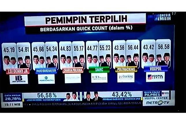 Dalam tayangan itu, muncul dua grafis penghitungan suara dari enam lembaga survey yang bekerja sama dengan Metro TV, yakni LSI Denny Ja, Indo Barometer, Charta Politika, Poltracking, SMRC, dan Voxpol.