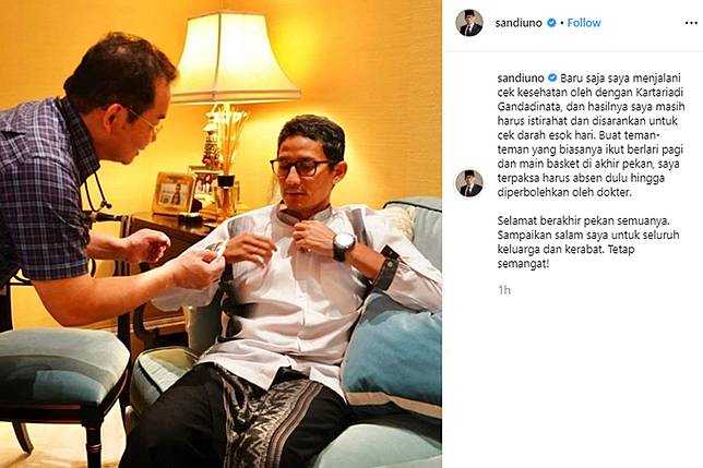 "Baru saja saya menjalani cek kesehatan oleh dengan Kartariadi Gandadinata, dan hasilnya saya masih harus istirahat dan disarankan untuk cek darah esok hari," kata Sandiaga, seperti dikutip dari unggahan tersebut.