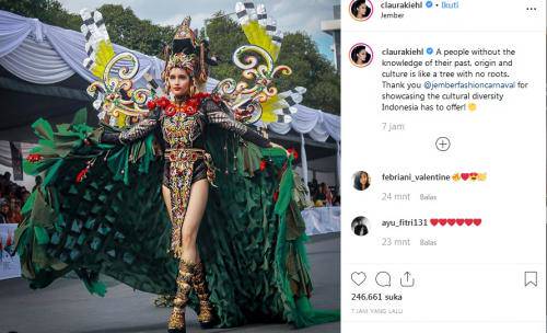 “A people without the knowledge of their past, origin and culture is like a tree with no roots. Thank you @jemberfashioncarnaval for showcasing the cultural diversity Indonesia has to offer. (Orang tanpa pengetahuan tentang masa lalu, asal-usul dan budaya mereka seperti pohon tanpa akar)," tulis Cinta di caption foto.